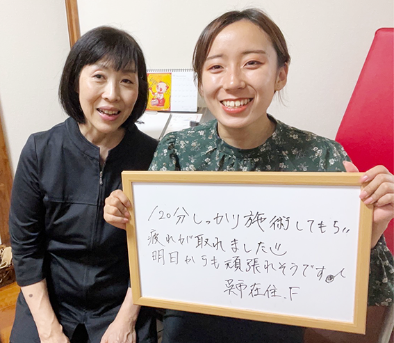 120分しっかり施術してもらい疲れが取れました!明日からも頑張れそうです。