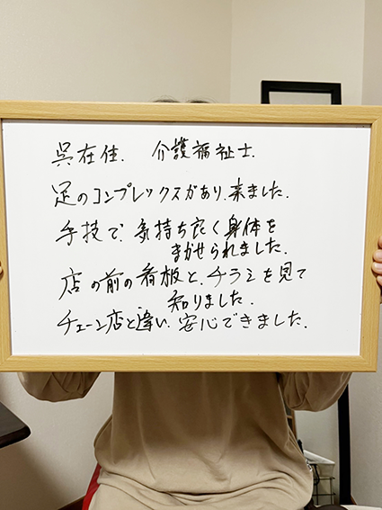 手技で気持ちよく身体を任せられました。店の前の看板とチラシを見て知りました。チェーン店と違い安心できました。
