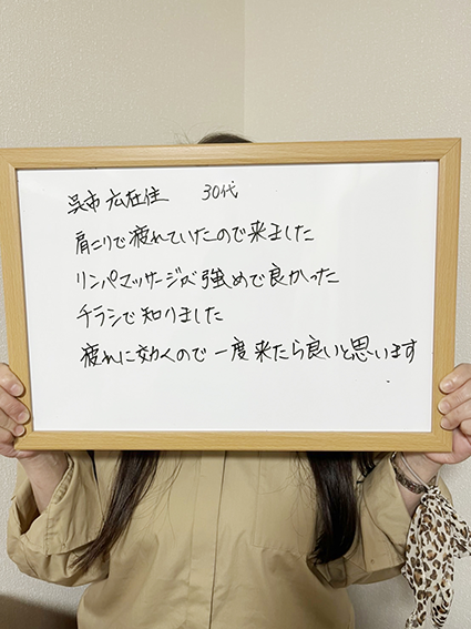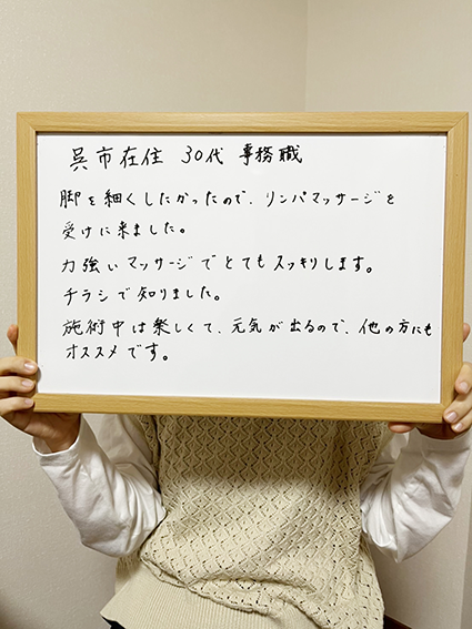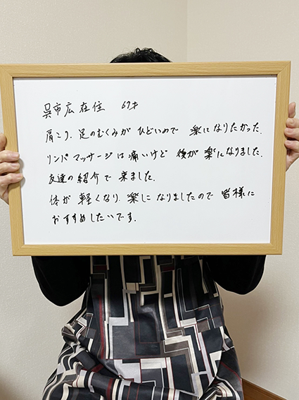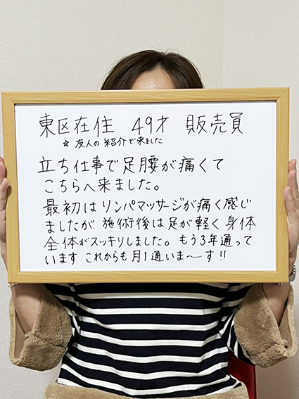 立ち仕事で足腰が痛くてこちらへ来ました。最初はリンパマッサージが痛く感じましたが、施術後は足が軽く身体全体がスッキリしました。もう3年通っています。これからも月1通いま〜す!