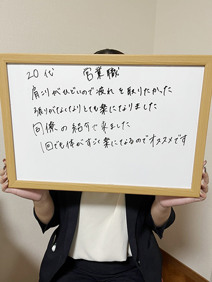 同僚の紹介で来ました。1回でも体がすごく楽になるのでオススメです。