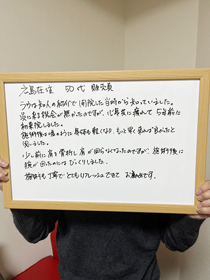 ラウ は知人の紹介で開院した当初から知っていました。呉に来る機会がなかったのですが、心身ともに疲れて5年前に初来院しました。