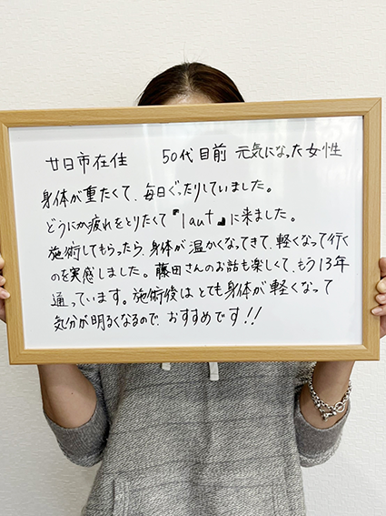 身体が重たくて毎日ぐったりしていました。どうにか疲れが取りたくて『laut』に来ました。施術してもらったら身体が温かくなってきて軽くなっていくのを実感しました。藤田さんのお話も楽しくて、もう13年通っています。施術後はとても身体が軽くなって気分が明るくなるのでお勧めです!!