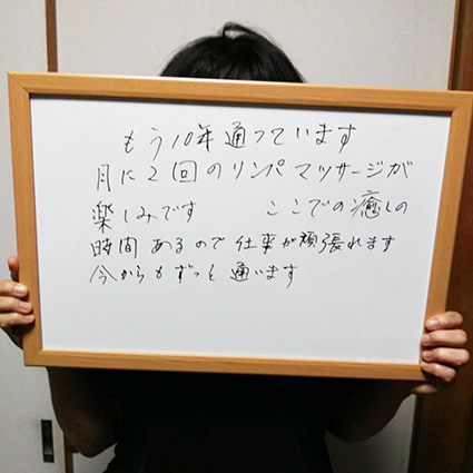 もう10年通っています。月に2回のリンパマッサージが楽しみです。ここでの癒しの時間があるので仕事が頑張れます。今からもずっと通います。