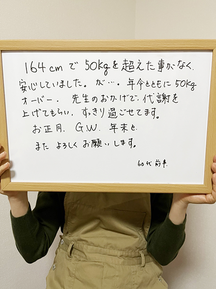 年齢とともに50kgオーバー。先生のおかげで代謝を上げてもらい、スッキリ過ごせてます。お正月、GW、年末とまたよろしくお願いします。
