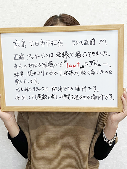 正直、マッサージとは無縁で過ごしてきました。友人の切なる推薦から『laut』にデビュー。結果、隠れコリと分かり、身体が軽く感じたのを覚えています。